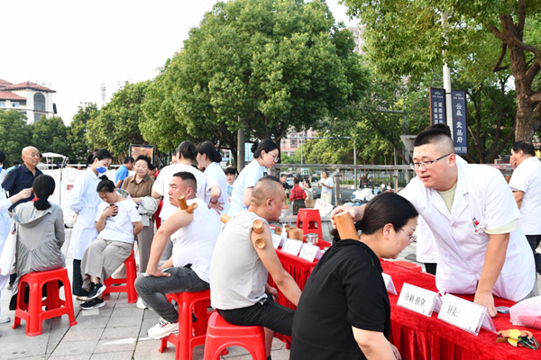 明光市中医院的志愿者在“明光之夏”纳凉集市上,为市民提供中医药特色服务。安徽省文明办供图