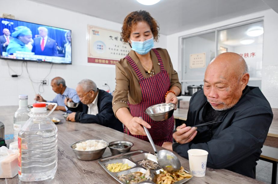 杏湾渔村养老食堂志愿者为老人添菜。乐清市文明办供图