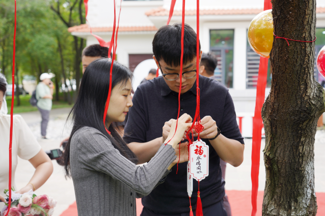 在主题背板前,新人们郑重签下姓名,以笔墨定格这一幸福时刻;一旁的“爱情树”下,每对新人领取专属许愿牌,认真书写对婚姻、家庭和事业的美好期许。随后,他们携手将许愿牌系于树枝,树干上渐渐挂满写满心愿的红色牌子——“愿我们携手走过每一个春夏秋冬”“愿平安顺遂、家庭和睦”……微风轻拂,许愿牌轻轻摇曳,将人们对爱情的向往化为具象而温暖的存在。