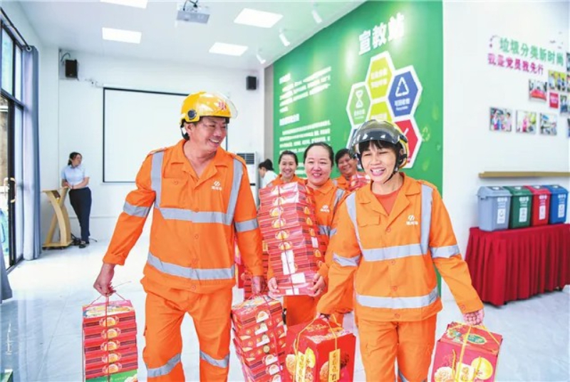 9月28日,在福龙马慈善驿站,环卫工人代表领到海口市慈善总会联合爱心企业送来的中秋月饼。海口市委文明办供图