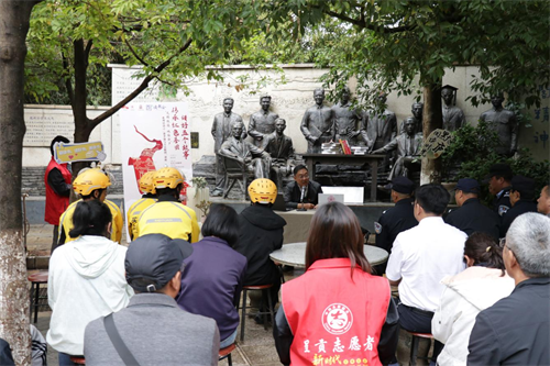 “文明市集”汇聚高校、企业、社会团体等志愿服务力量,各街道举办主题市集20余场。“呈贡记忆”宣讲活动聚焦讲好“五个故事”,龙城街道打造革命文化宣讲队,用大学生、小学生的“新声音”传递呈贡红色记忆、西南联大往事,串联三台山、冰心默庐等文化研学路线。“以书会友”活动以笔墨书香+斗南花香、设置微型读书角、各社区农家书屋效能提升等,带动全民阅读蔚然成风。“反诈防诈”宣传覆盖不断扩大,斗南街道成立街道宣讲队、乌龙街道动员新业态群体、吴家营街道联动高校,线上线下结合,实现反诈宣传全域覆盖,电诈发案率显著下降。4大专项行动,全面提升全区新时代文明实践工作质效。 “呈贡记忆”宣讲活动现场。图片来源:呈贡区委文明办